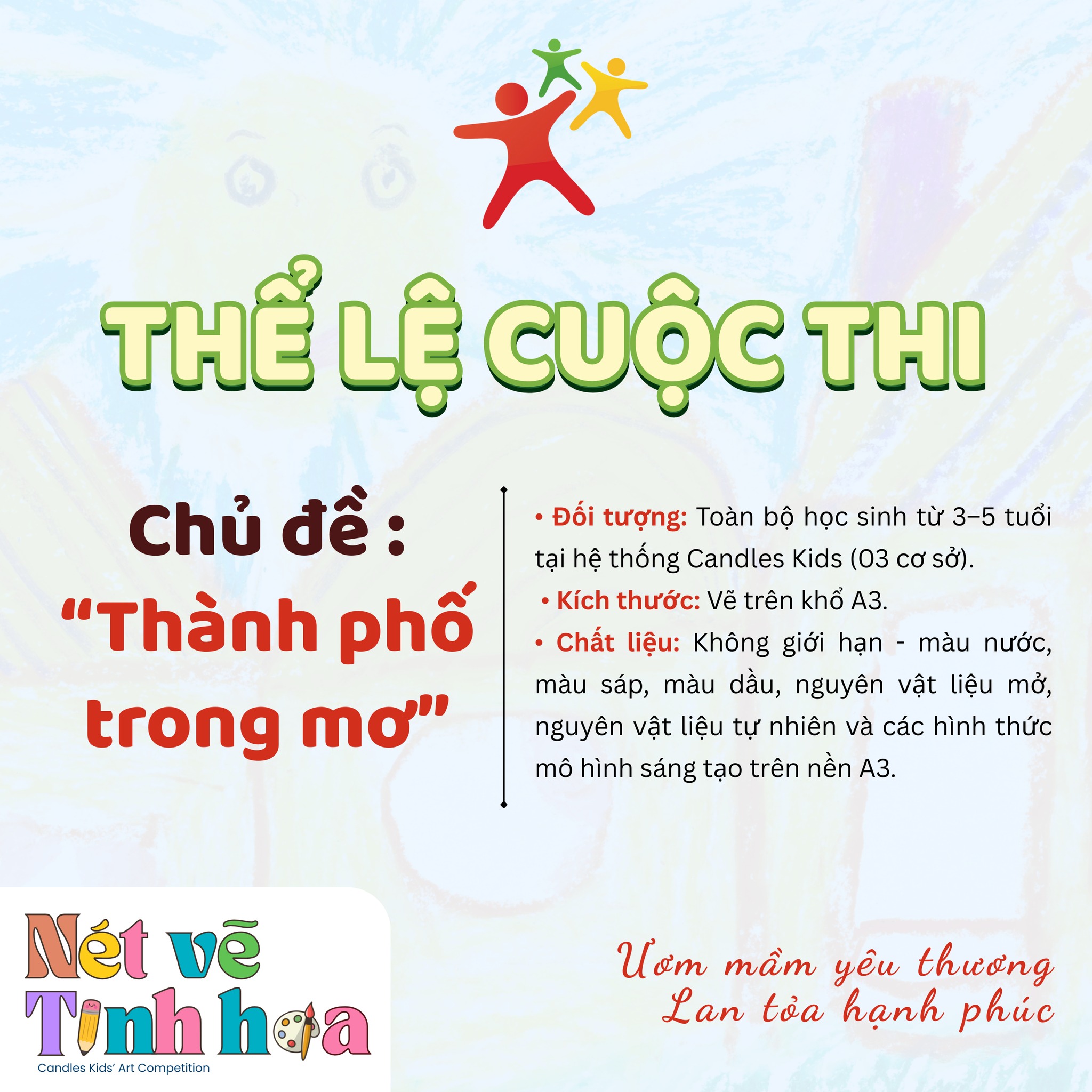 Cuộc thi vẽ tranh “Nét Vẽ Tinh Hoa – Thành phố trong mơ” tại Candles Kids là sân chơi nghệ thuật giúp trẻ 3–5 tuổi phát huy trí tưởng tượng, khả năng biểu đạt cảm xúc và nuôi dưỡng tình yêu hội họa ngay từ những năm đầu đời.