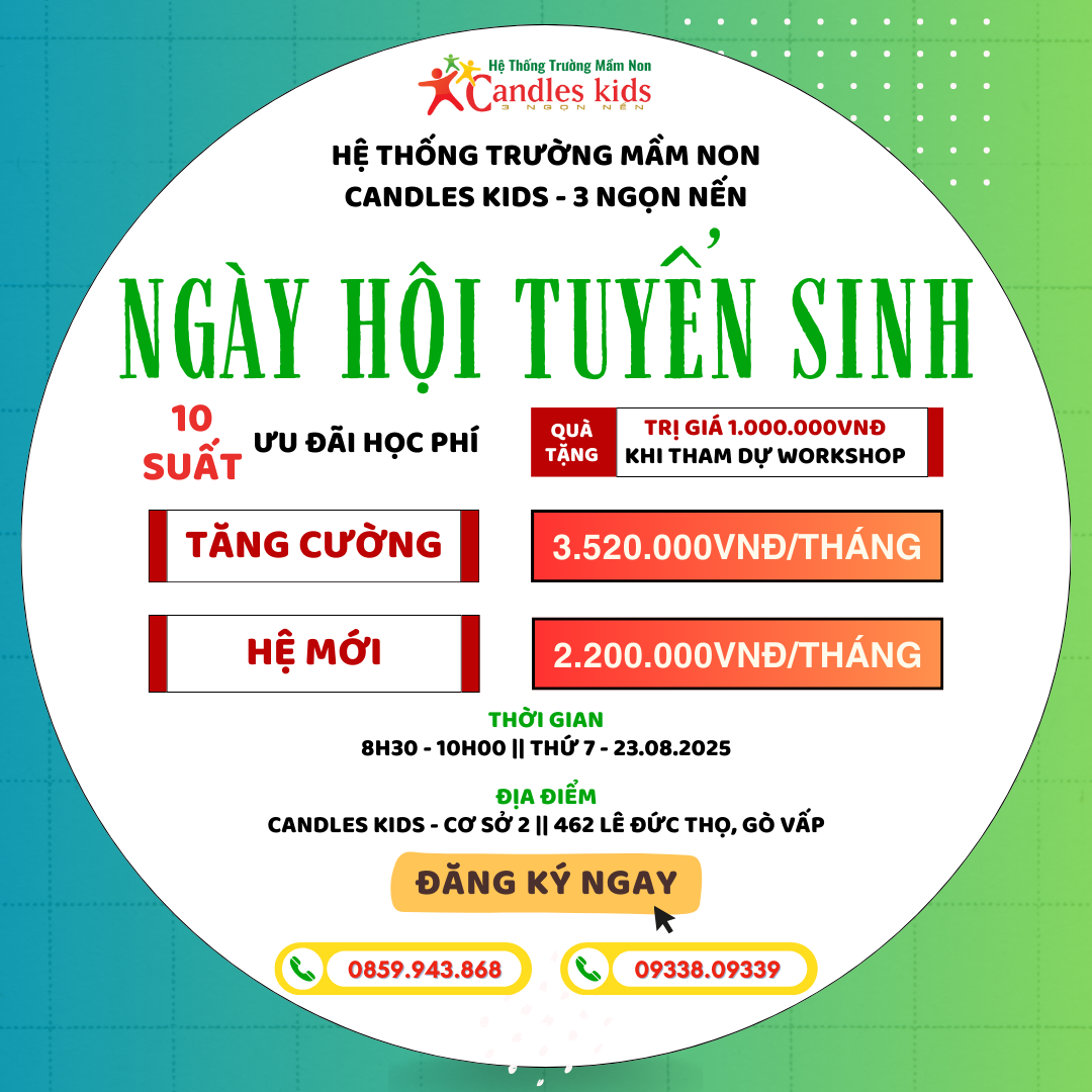 Ngày 23/08/2025 sắp tới, Hệ thống Trường Mầm non Candles Kids – 3 Ngọn Nến sẽ tổ chức Ngày hội Tuyển sinh tại cơ sở 2 (462 Lê Đức Thọ, Gò Vấp). Đây là sự kiện đặc biệt mang đến cho phụ huynh cơ hội nhận ưu đãi học phí giới hạn, đồng thời tạo không gian trải nghiệm văn hóa, nghệ thuật và kỹ năng sống dành cho trẻ.