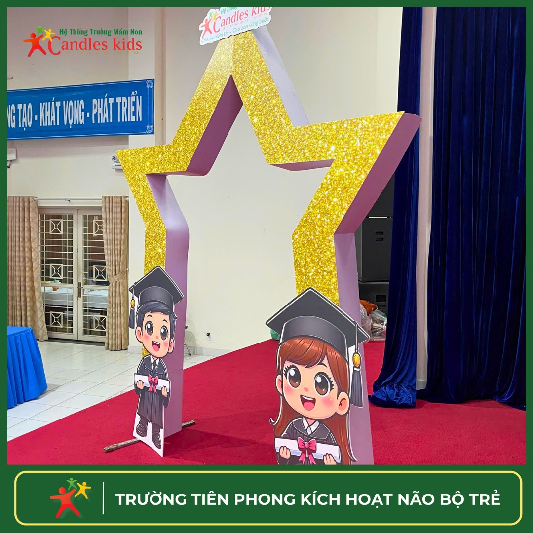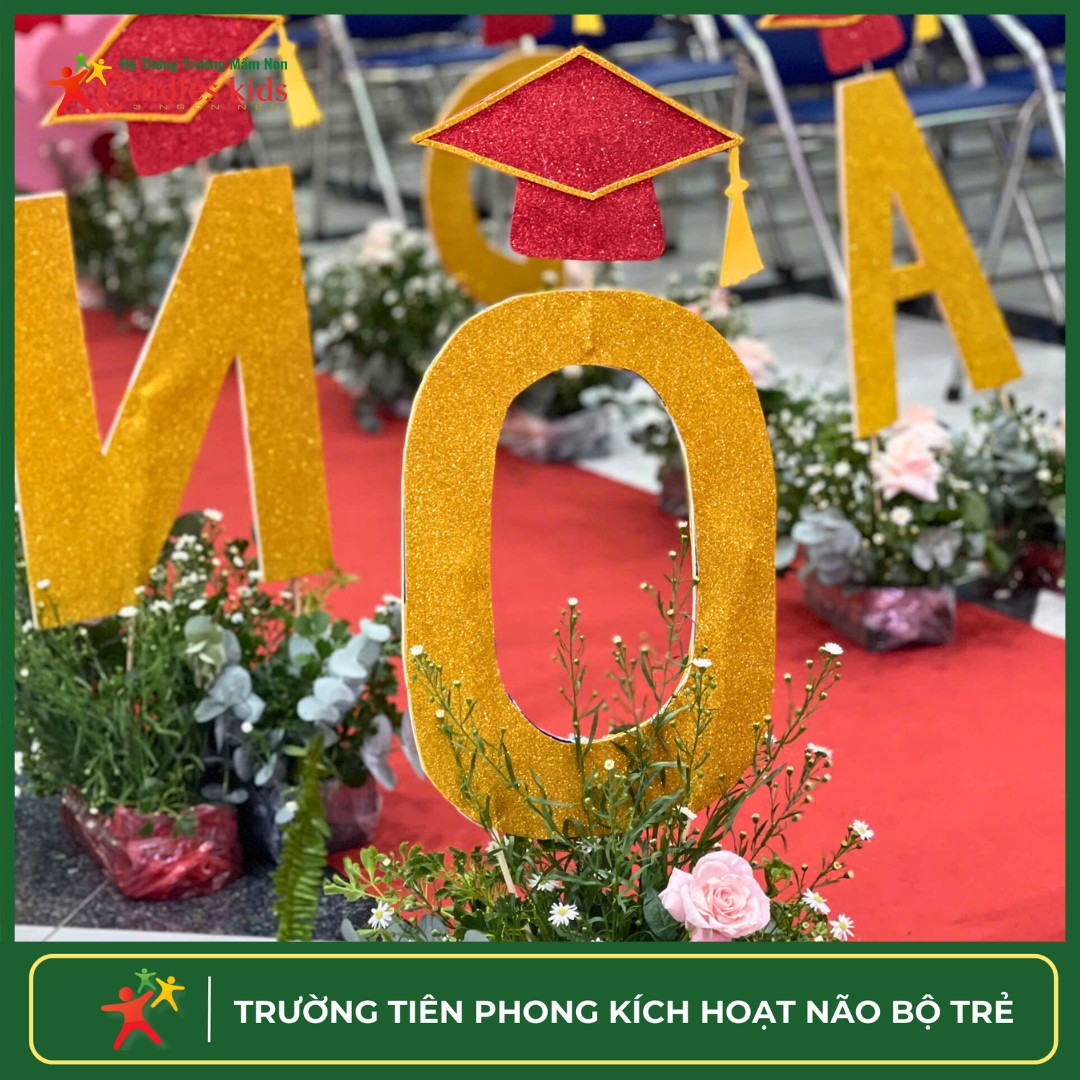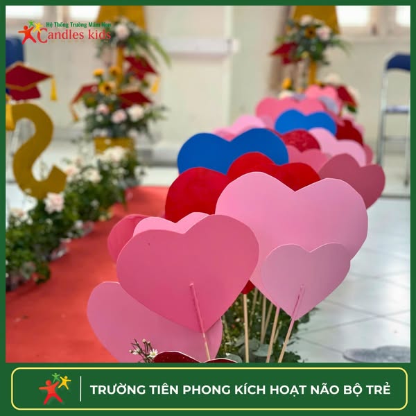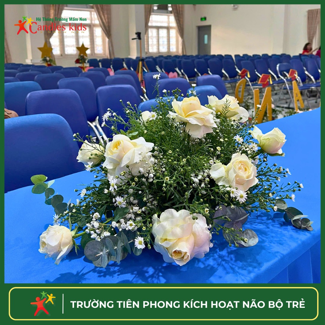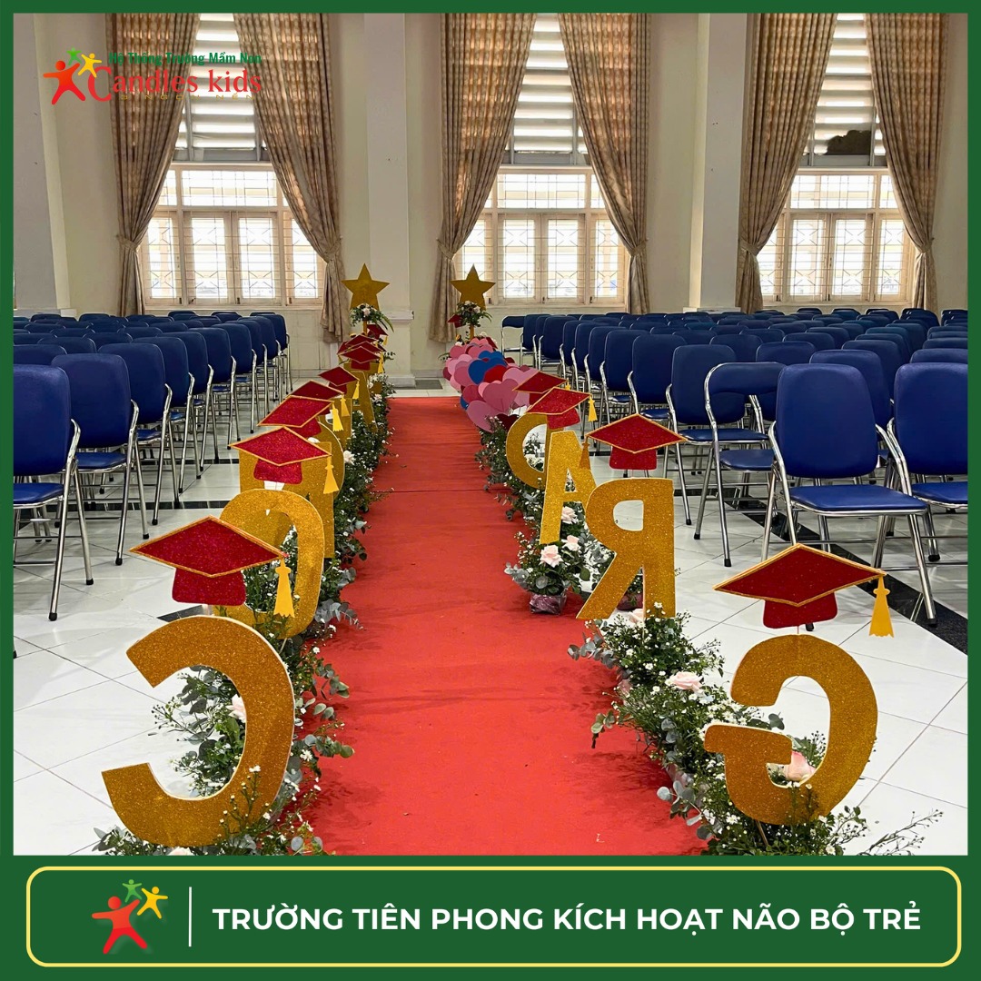 Sáng nay, tại hội trường Candles Kids – 3 Ngọn Nến, mọi thứ đang dần hoàn thiện cho buổi lễ tốt nghiệp đáng mong đợi của các bé lớp Lá. Một không gian vừa lặng lẽ, vừa đầy xúc cảm – nơi những chuẩn bị cuối cùng mang theo cả sự hồi hộp lẫn tự hào.