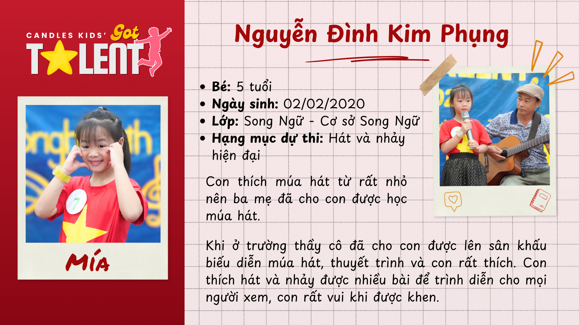 Bé Nguyễn Đình Kim Phụng (Mía) hiện 5 tuổi, đang theo học chương trình Song Ngữ tại Candles Kids – 3 Ngọn Nến. Từ khi mới 3 tuổi, Mía đã bộc lộ sự hoạt bát, yêu âm nhạc và đặc biệt tự tin mỗi khi đứng trước đám đông. Đến năm 4 tuổi, các giáo viên tại trường mầm non đã sớm nhận ra năng khiếu nổi bật của con trong lĩnh vực hát, nhảy và biểu diễn sân khấu.