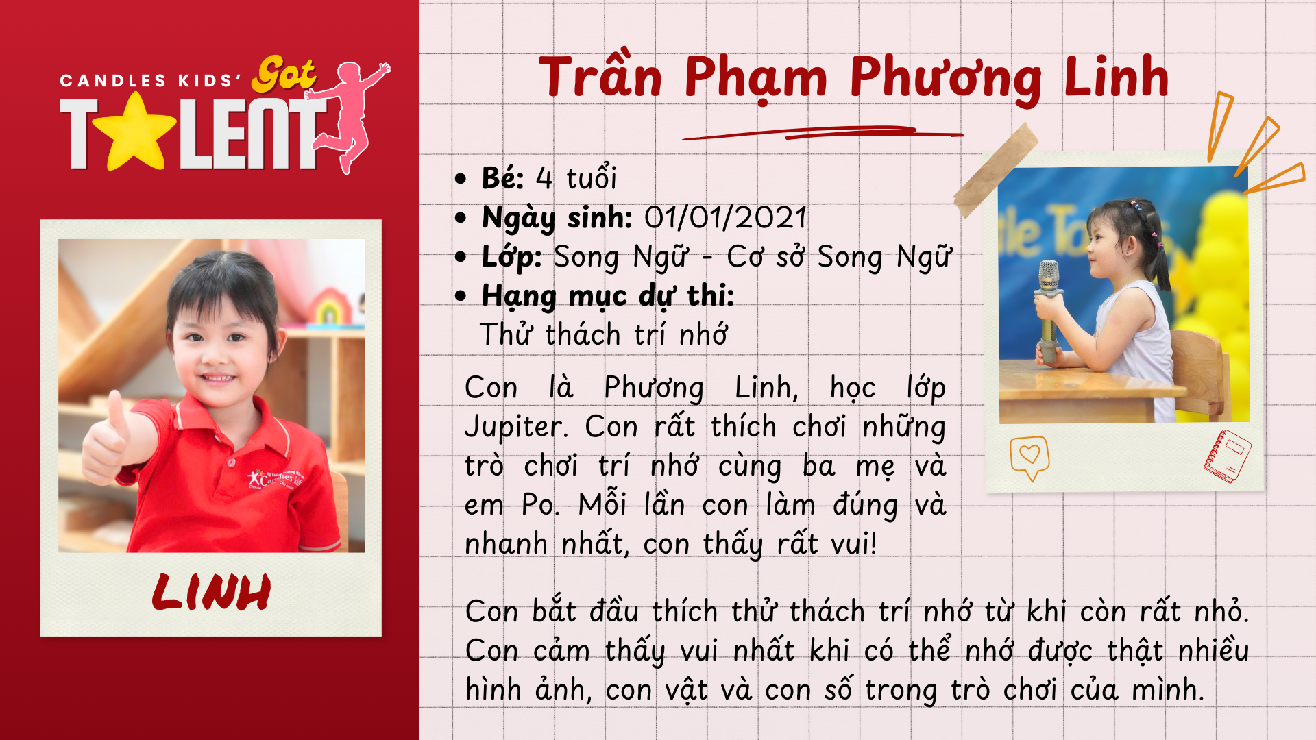Phương Linh hiện đang tham gia Candles Kids’ Got Talent – Hạng mục Thử thách trí nhớ, một sân chơi được tổ chức nhằm tôn vinh những năng lực riêng của trẻ mầm non.