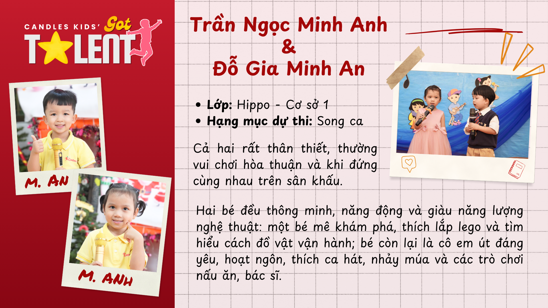 Minh Anh nhập học từ năm 2022, khi con mới 25 tháng tuổi, sớm cho thấy sự chững chạc, tinh tế và khả năng kiểm soát cảm xúc tốt khi đứng trước đám đông. Trong khi đó, Minh An – gia nhập đại gia đình Candles Kids năm 2023 – lại mang đến nguồn năng lượng tươi sáng, hồn nhiên và vô cùng dễ thương. Hai cá tính tưởng chừng khác biệt ấy đã hòa quyện một cách tự nhiên khi cùng lựa chọn hạng mục Song ca, một phần thi đòi hỏi sự tự tin, lắng nghe và phối hợp nhịp nhàng.