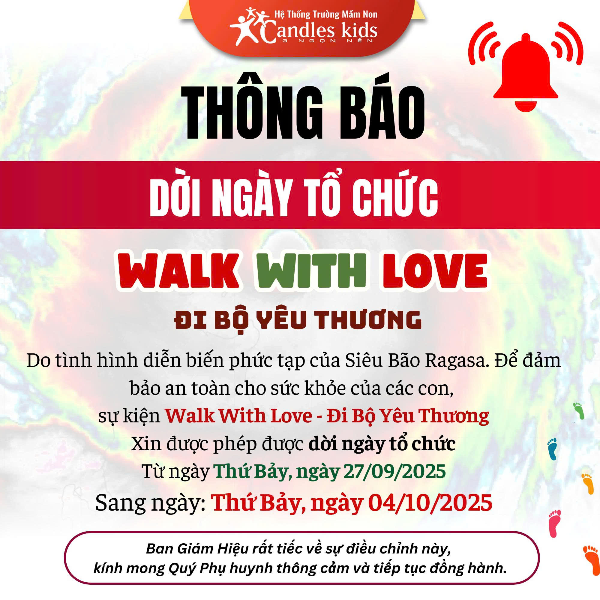Do ảnh hưởng của cơn bão Ragasa, Ban Tổ Chức chương trình “Walk With Love – Đi Bộ Yêu Thương” của Hệ thống Trường Mầm non Candles Kids – 3 Ngọn Nến xin thông báo điều chỉnh thời gian tổ chức sự kiện, nhằm đảm bảo an toàn tuyệt đối cho các con, phụ huynh và đội ngũ giáo viên.