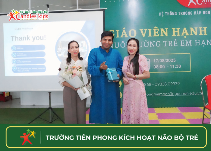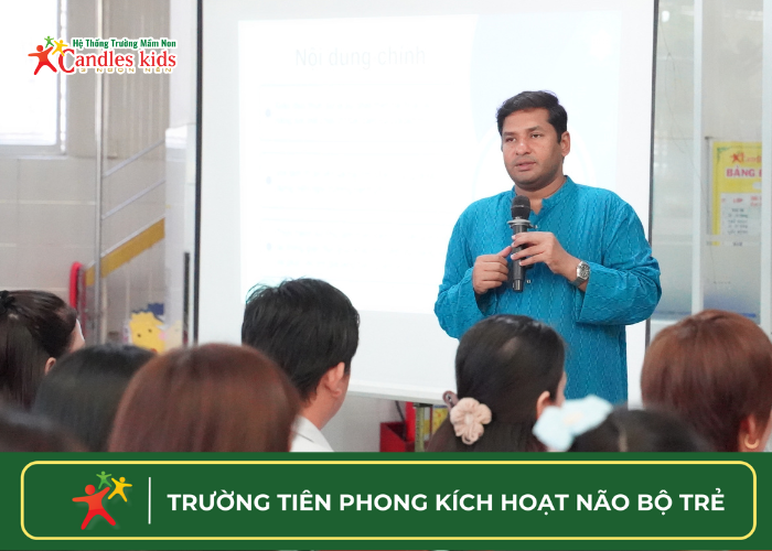 Đại diện Ban lãnh đạo Candles Kids gửi lời tri ân sâu sắc đến chuyên gia Pradeep Vijay vì đã truyền cảm hứng và tiếp thêm ngọn lửa yêu nghề cho tập thể sư phạm. Đồng thời, nhà trường cũng khẳng định sẽ tiếp tục triển khai nhiều hoạt động đào tạo, workshop chuyên sâu nhằm đồng hành cùng giáo viên trong cả chuyên môn lẫn chăm sóc tinh thần.